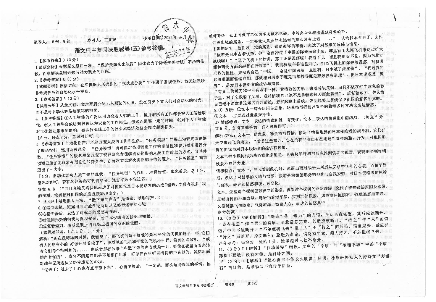 河北省衡水中学2024届高三下学期高考押题密卷(五)语文答案