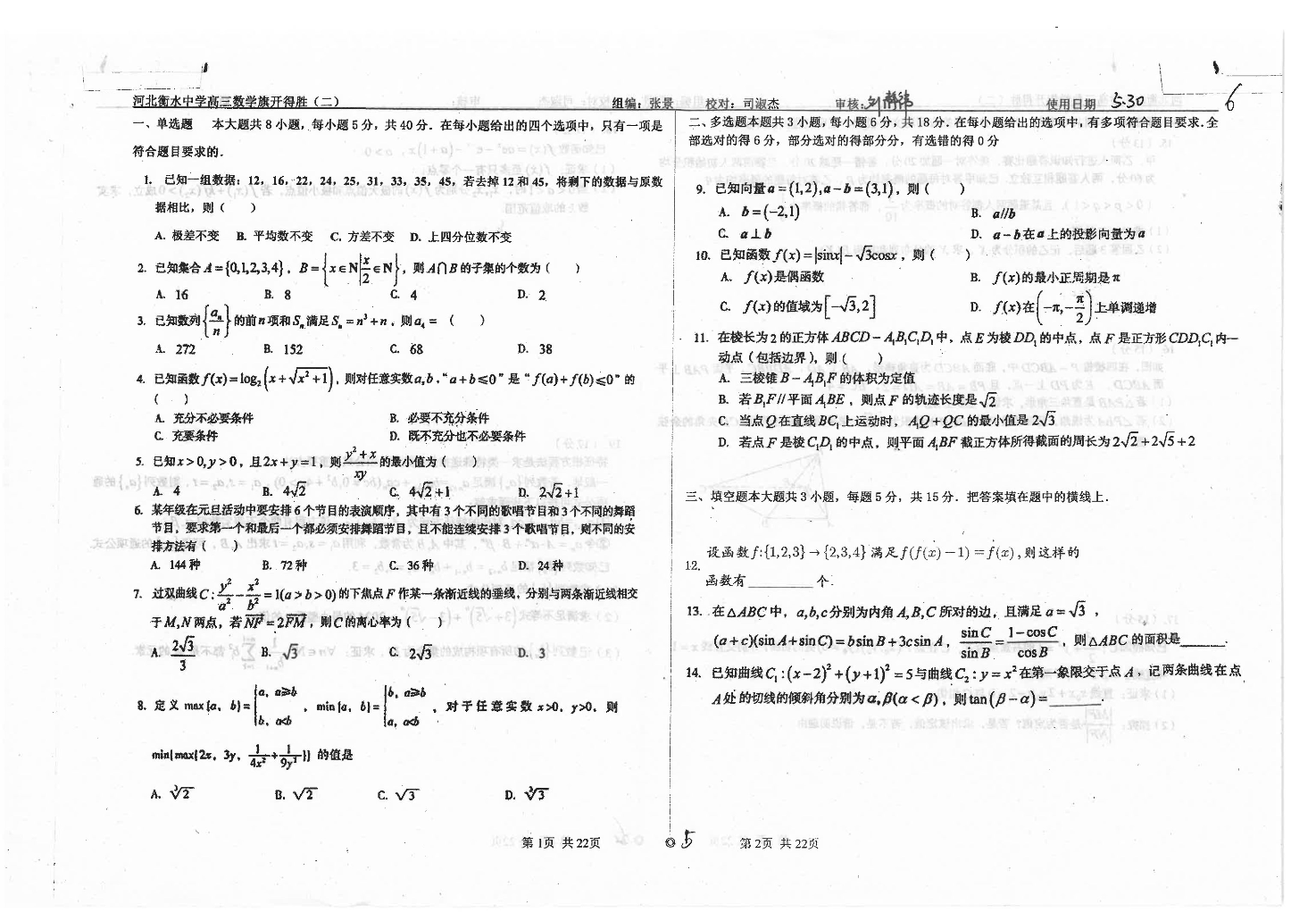 河北省衡水中学2024届高三下学期高考押题密卷(二)数学
