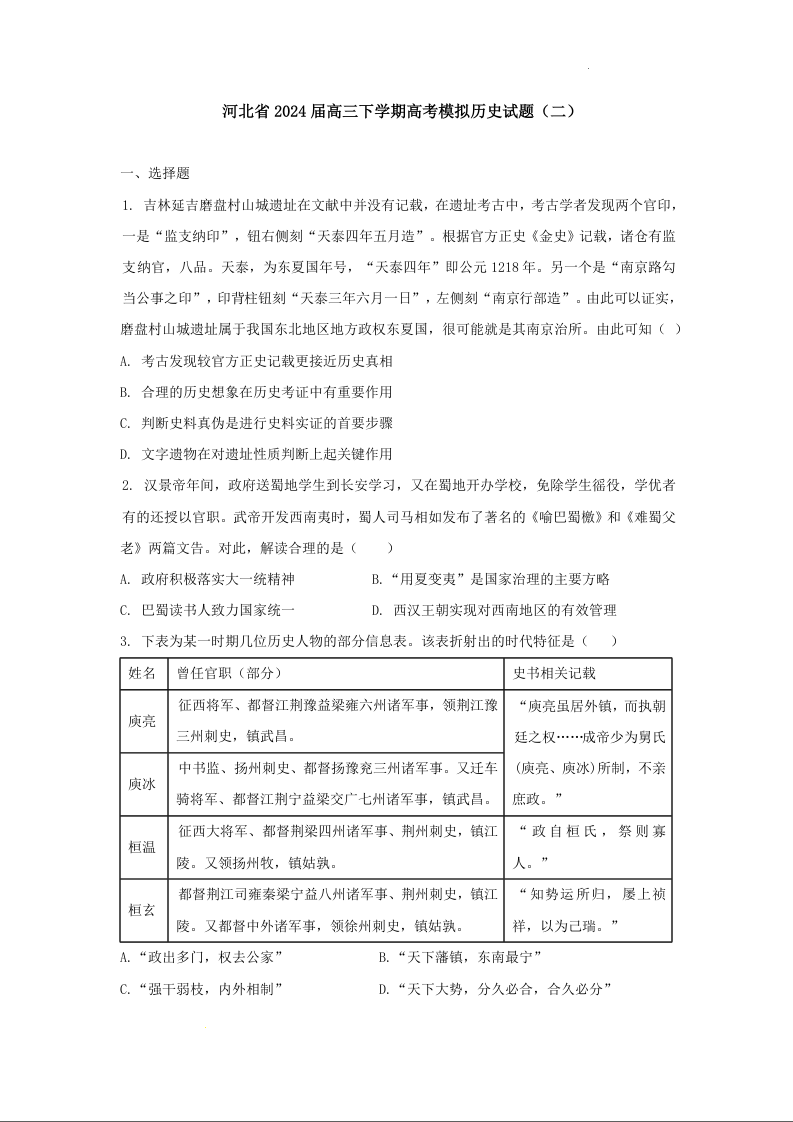 河北省衡水中学2024届高三下学期高考押题密卷(二)历史+答案
