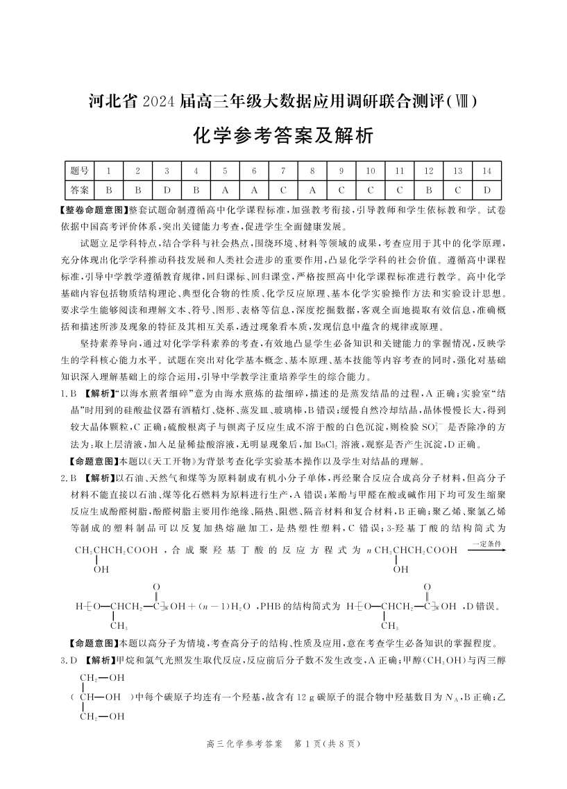 河北省2024届高三下学期大数据应用调研联合测评化学答案