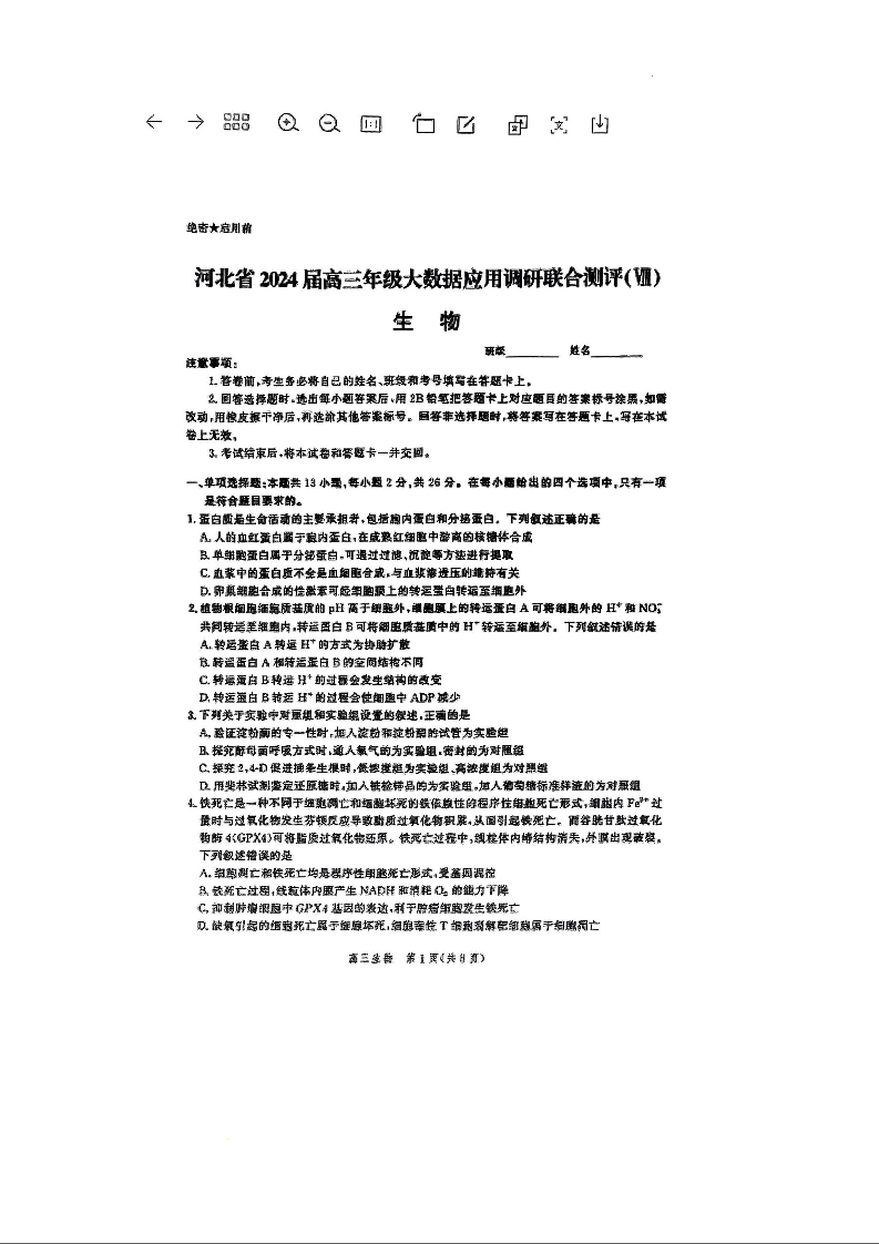 河北省2024届高三下学期大数据应用调研联合测评生物