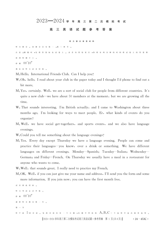 河北省保定市2024届高三二模英语答案