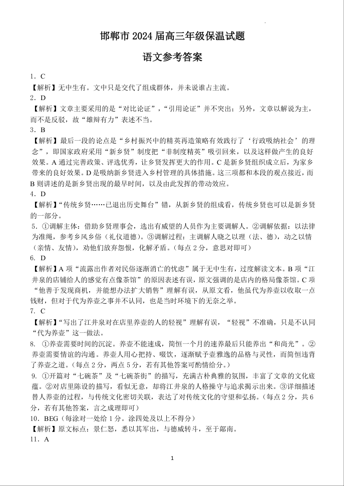 河北省邯郸市2024届高三下学期5月保温卷语文答案