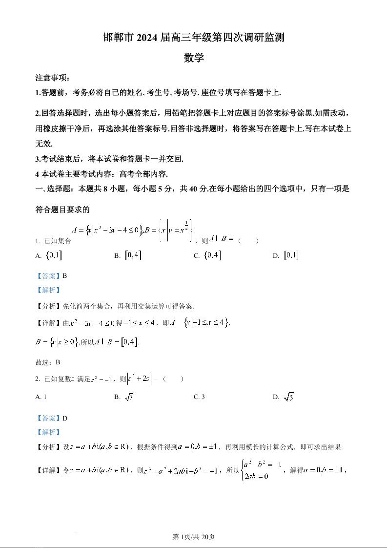 河北省邯郸市2024届高三下学期5月保温卷数学(精品解析版)