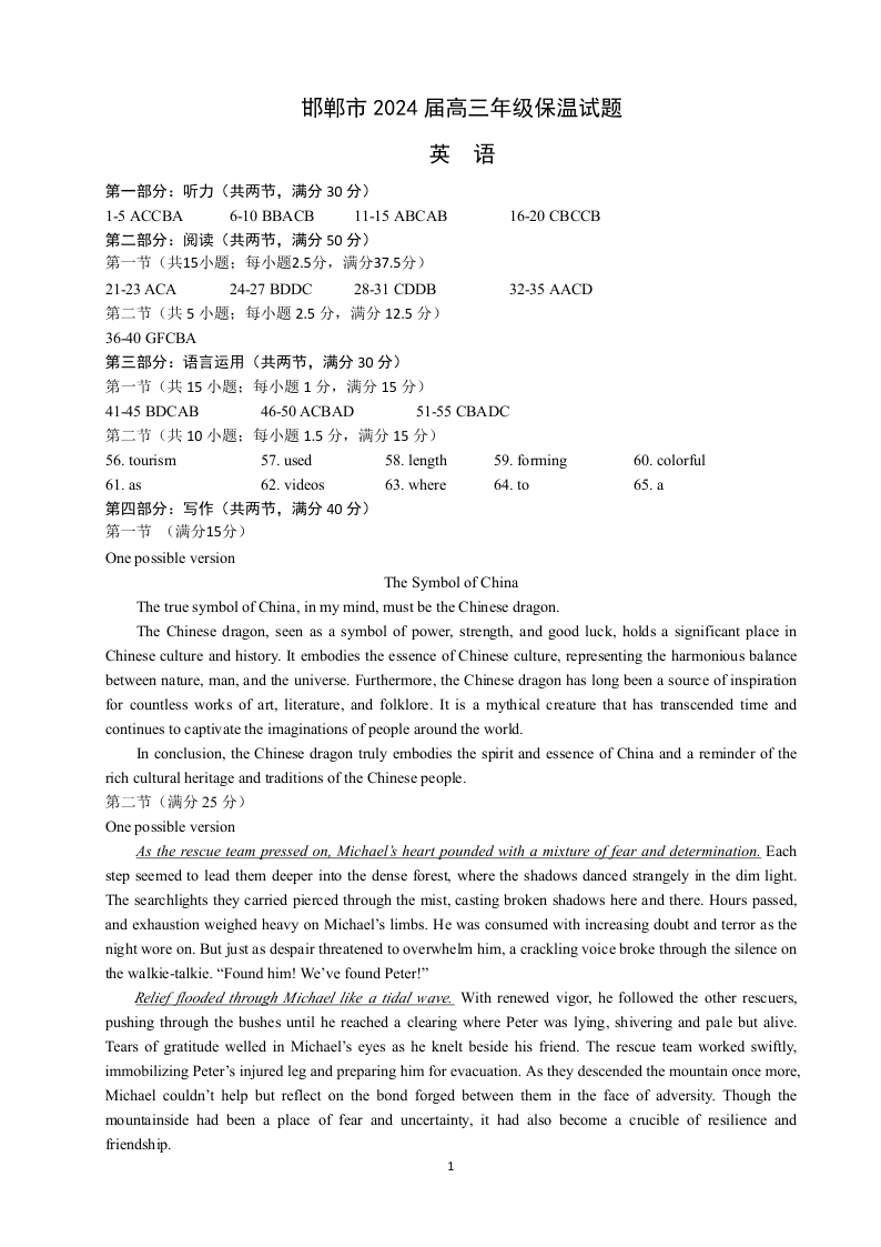 河北省邯郸市2024届高三下学期5月保温卷英语答案