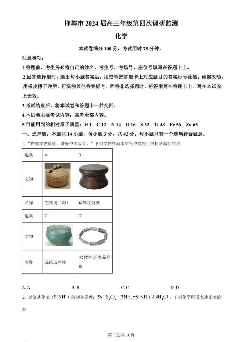 河北省邯郸市2024届高三下学期5月保温卷化学(原卷版)