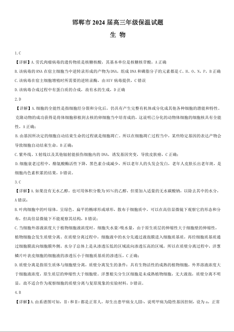 河北省邯郸市2024届高三下学期5月保温卷生物答案