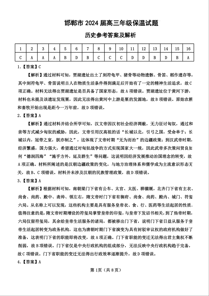 河北省邯郸市2024届高三下学期5月保温卷历史答案