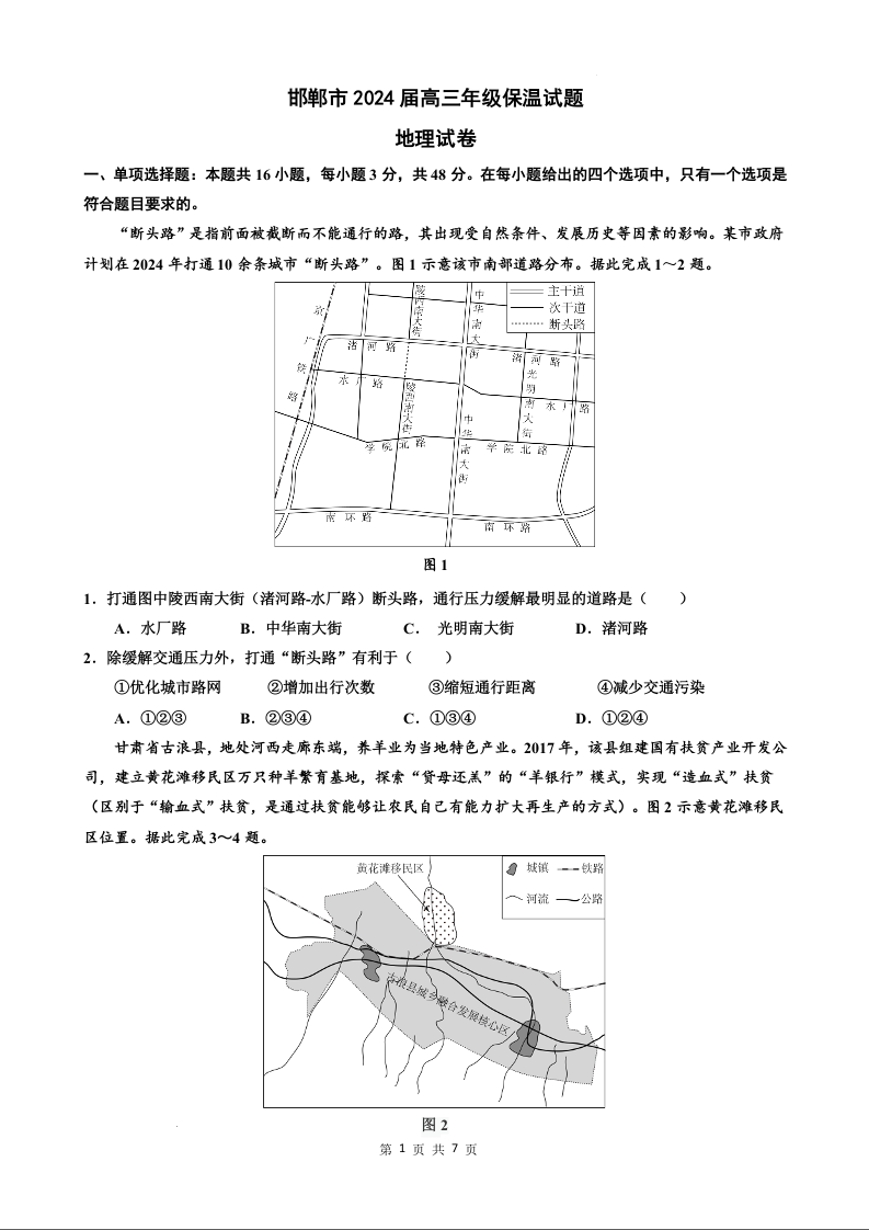 河北省邯郸市2024届高三下学期5月保温卷地理