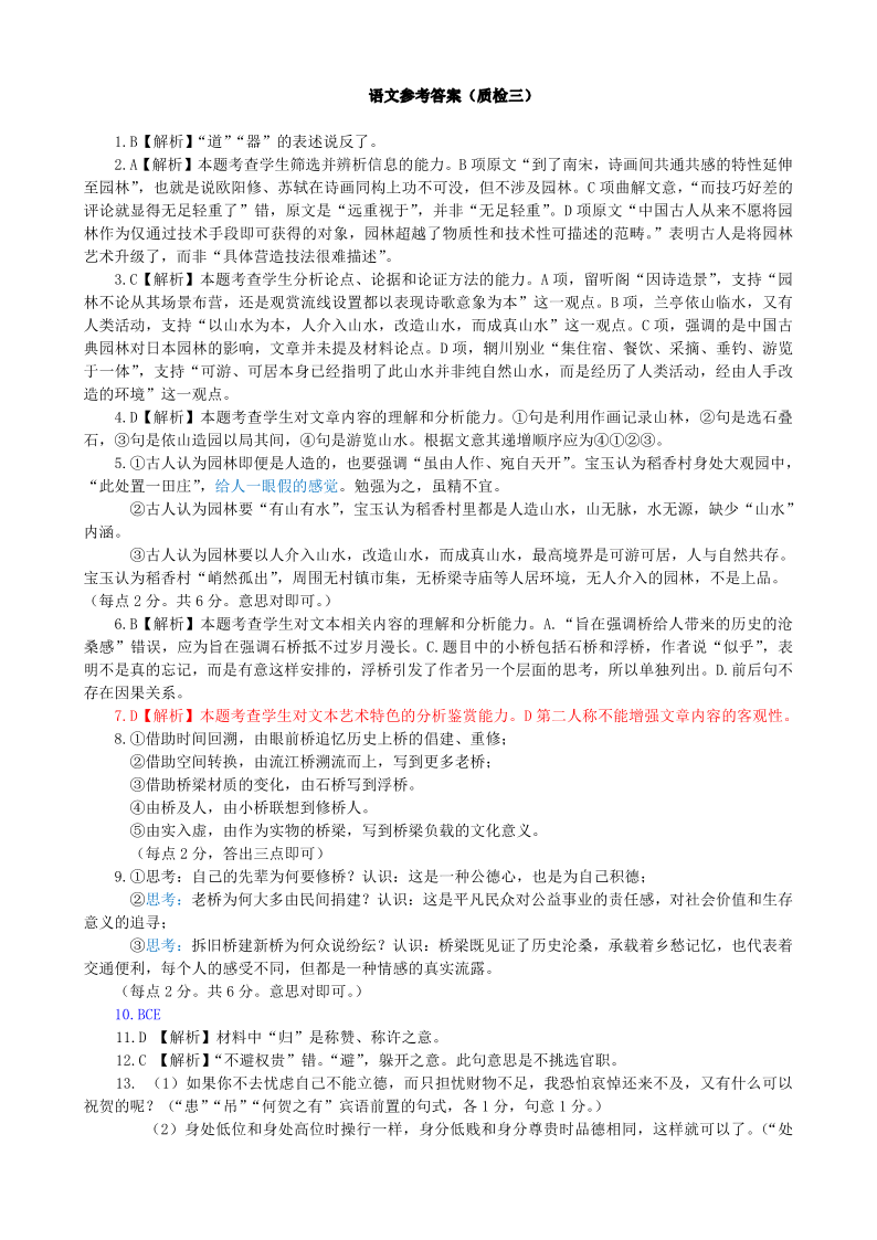 河北省石家庄市2024届高三教学质量检测(三)语文答案