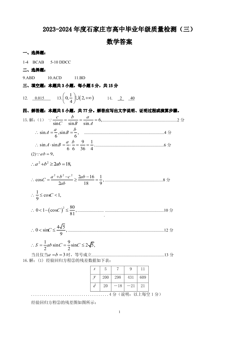 河北省石家庄市2024届高三教学质量检测(三)数学答案