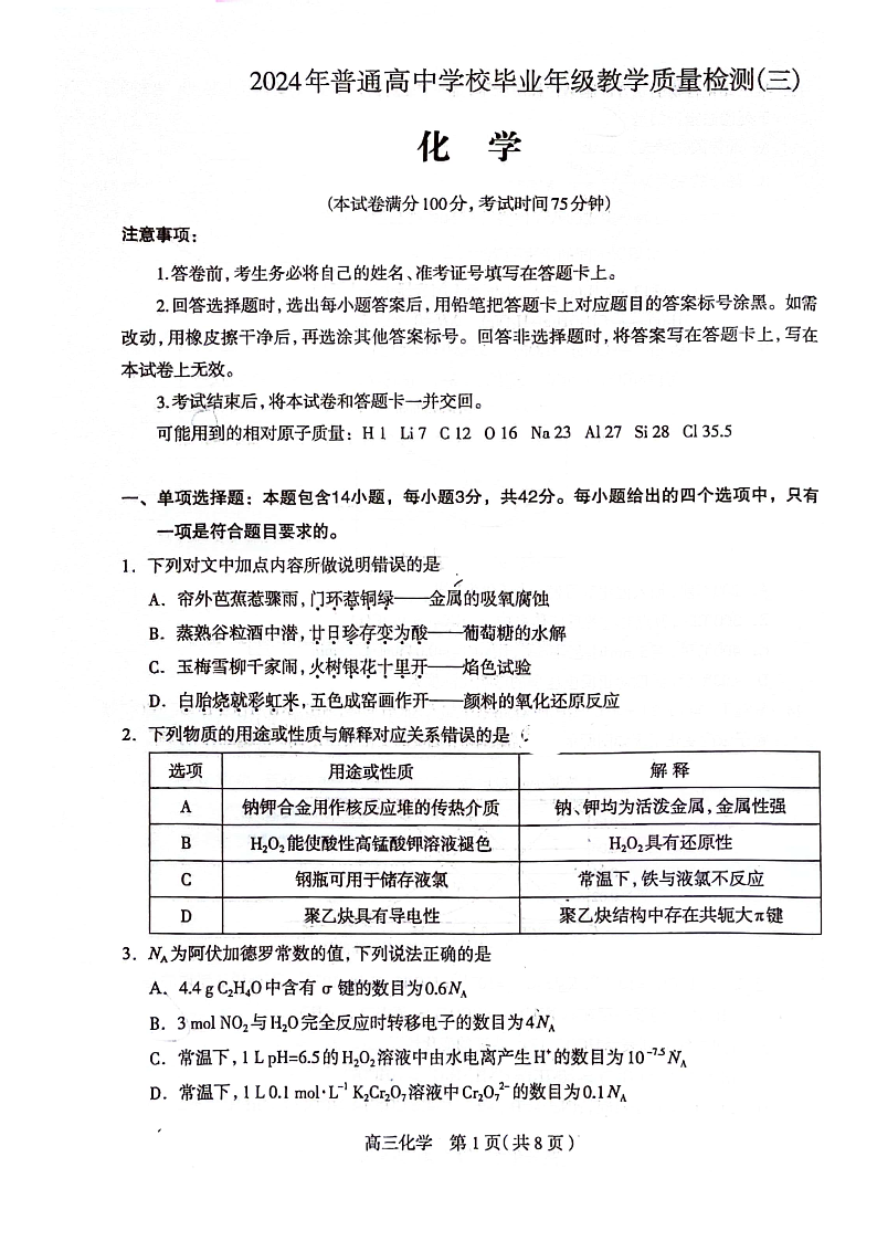 河北省石家庄市2024届高三教学质量检测(三)化学