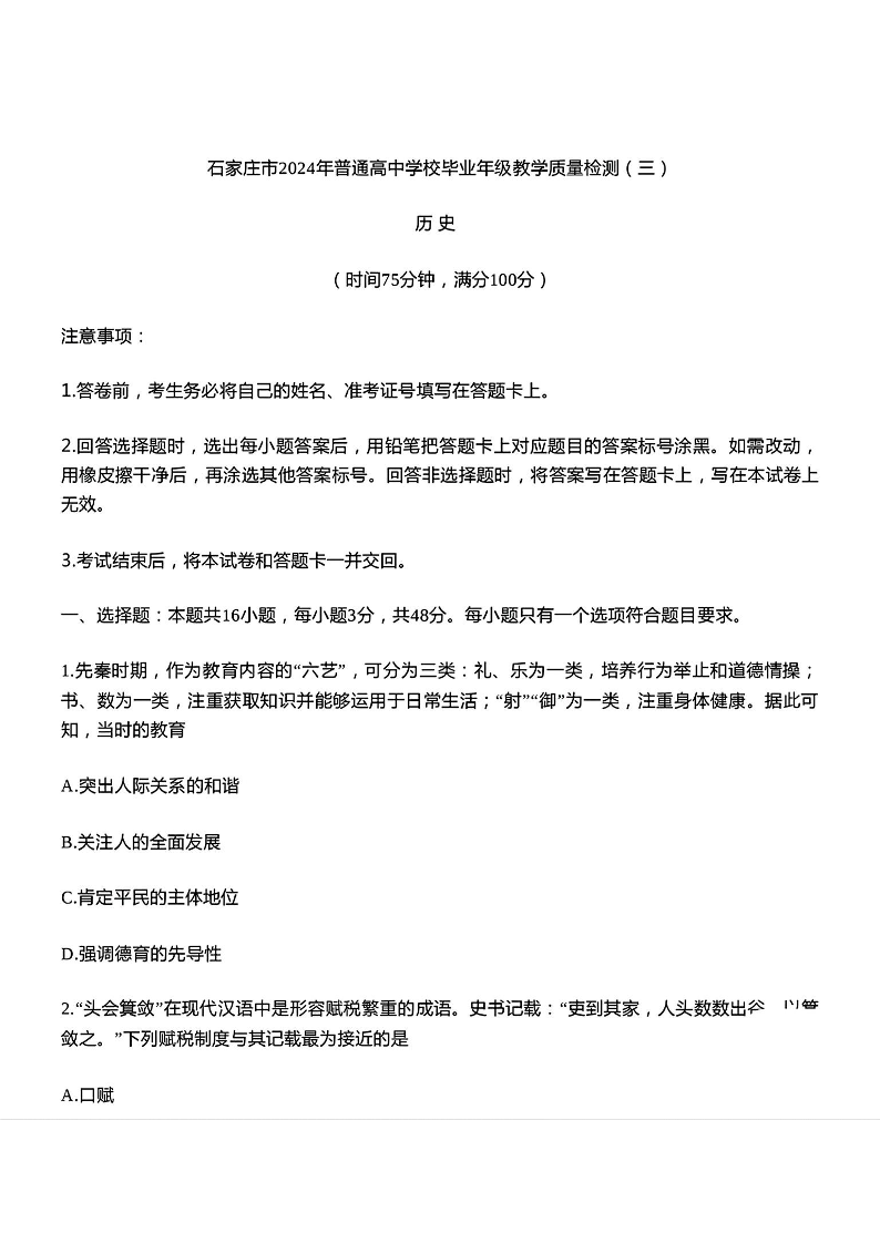 河北省石家庄市2024届高三教学质量检测(三)历史