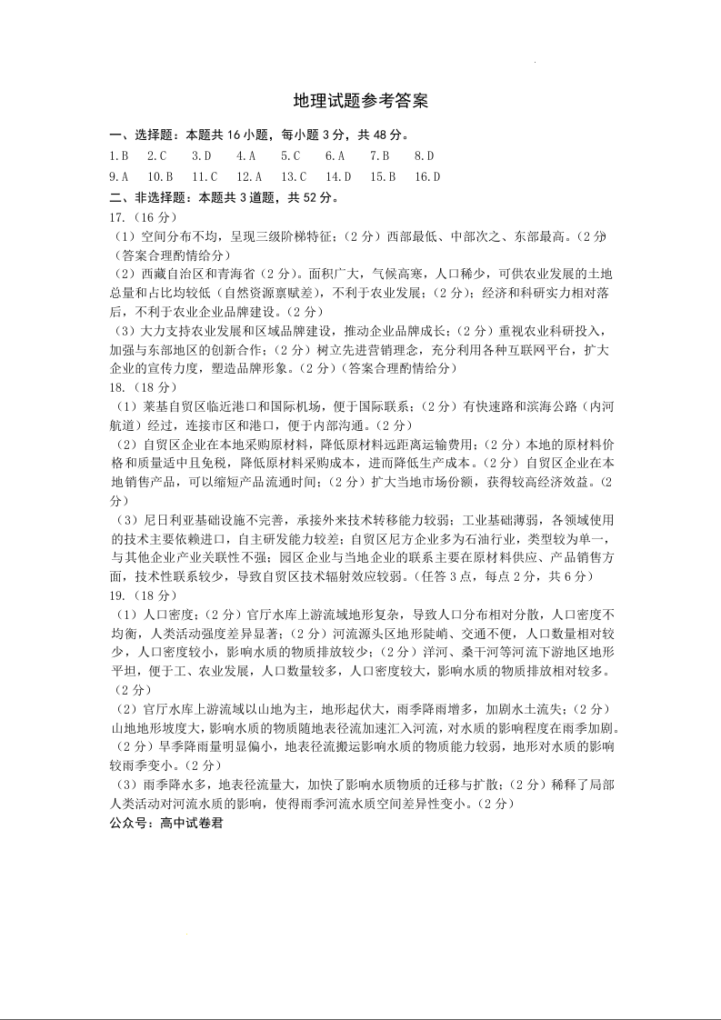 河北省石家庄市2024届高三教学质量检测(三)地理答案