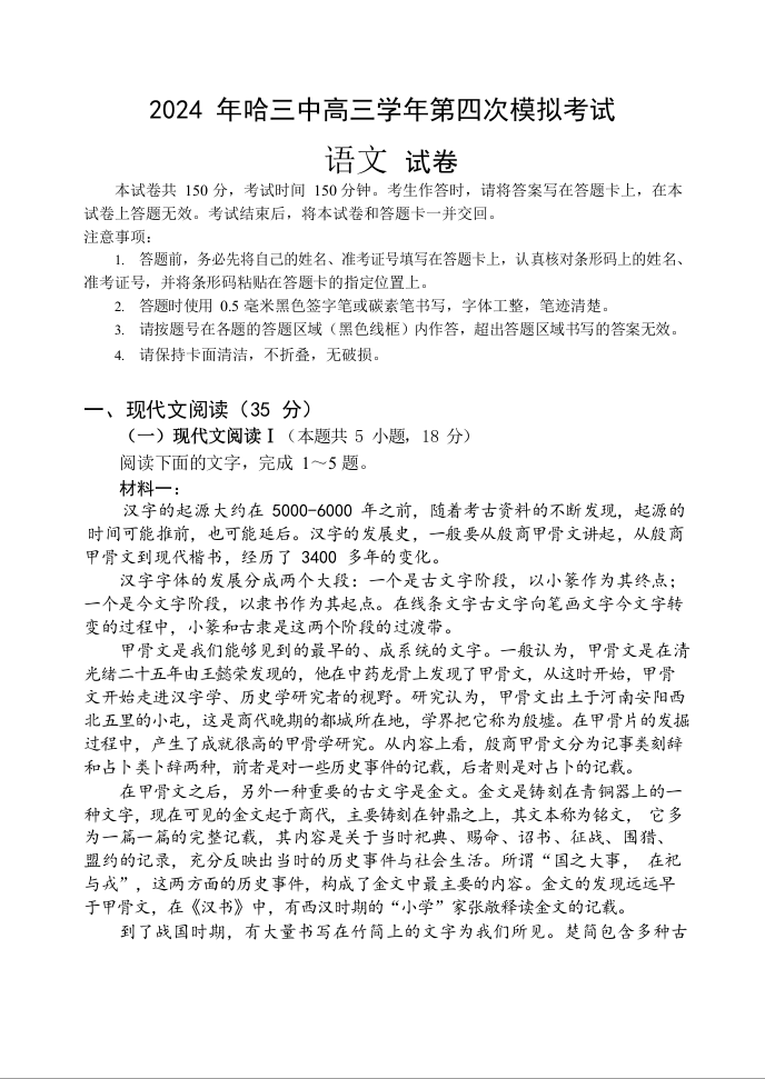 黑龙江哈尔滨第三中学2024届高三上学期第四次模拟考语文