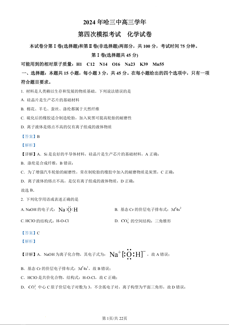 黑龙江哈尔滨第三中学2024届高三上学期第四次模拟考化学(精品解析版)