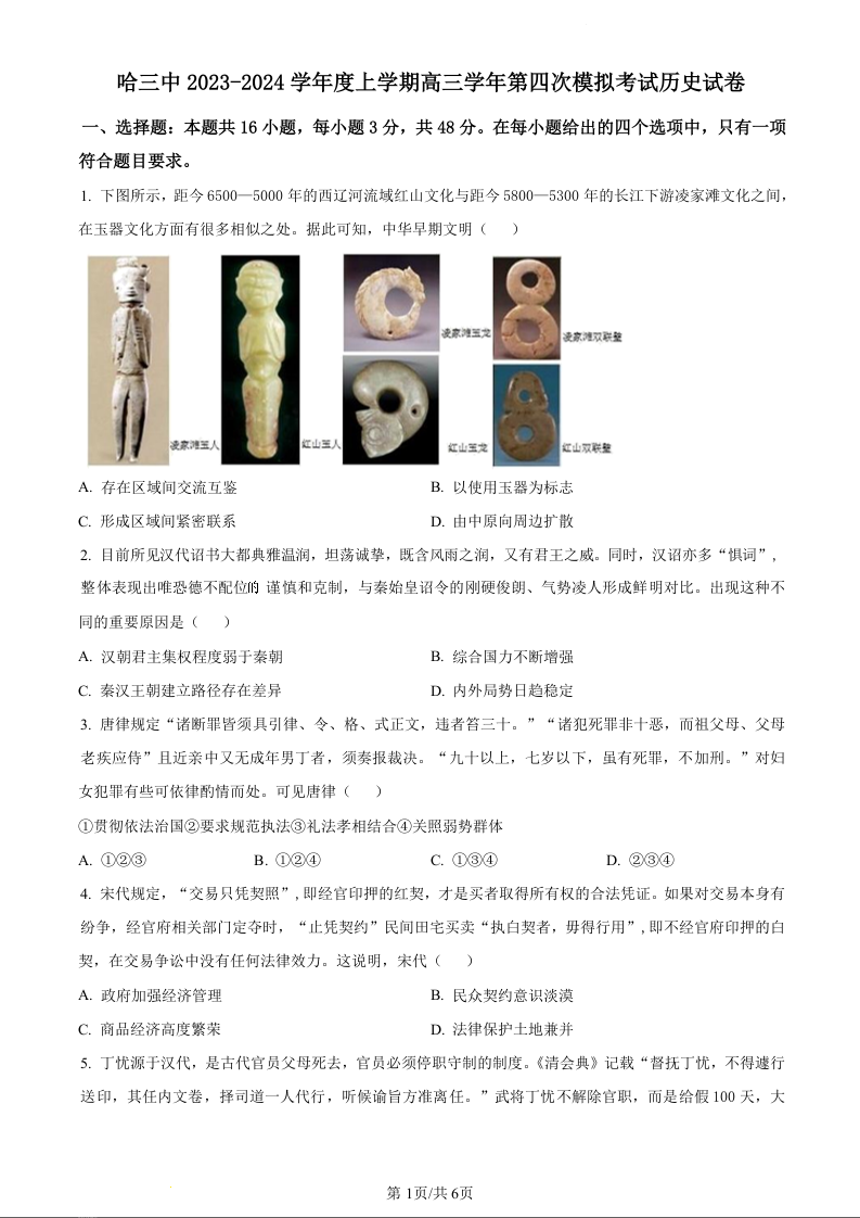 黑龙江哈尔滨第三中学2024届高三上学期第四次模拟考历史(原卷版)