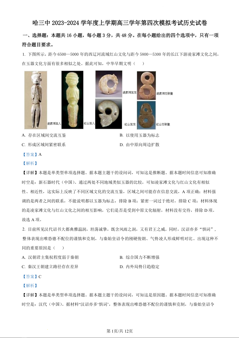 黑龙江哈尔滨第三中学2024届高三上学期第四次模拟考历史(精品解析版)