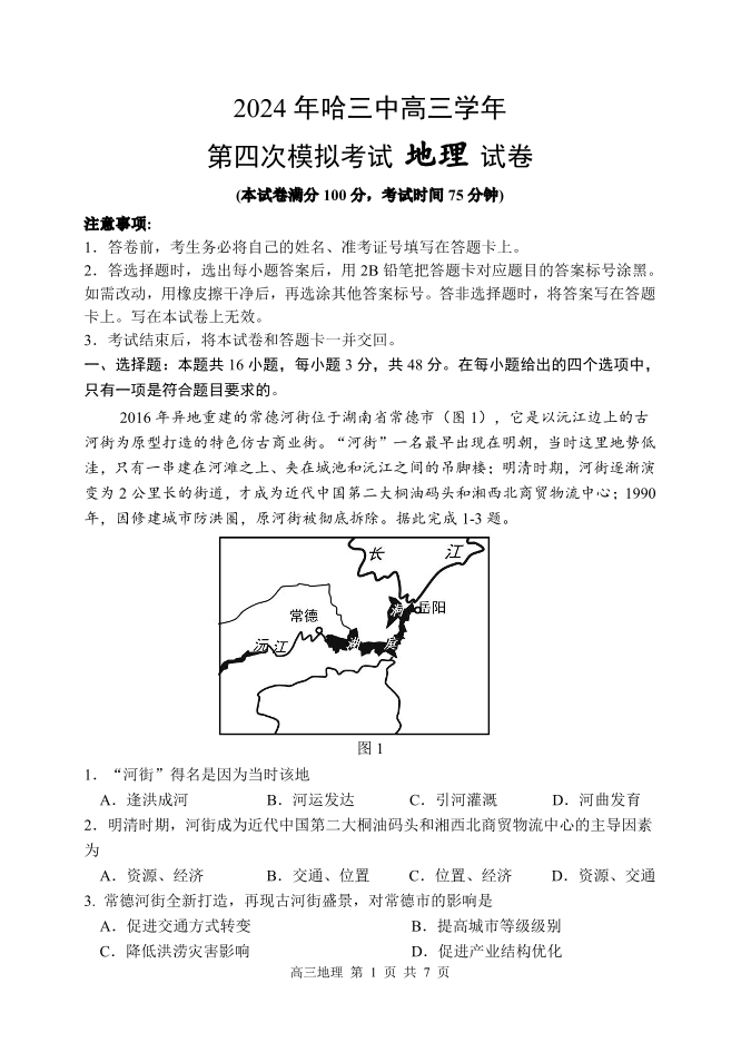 黑龙江哈尔滨第三中学2024届高三上学期第四次模拟考地理