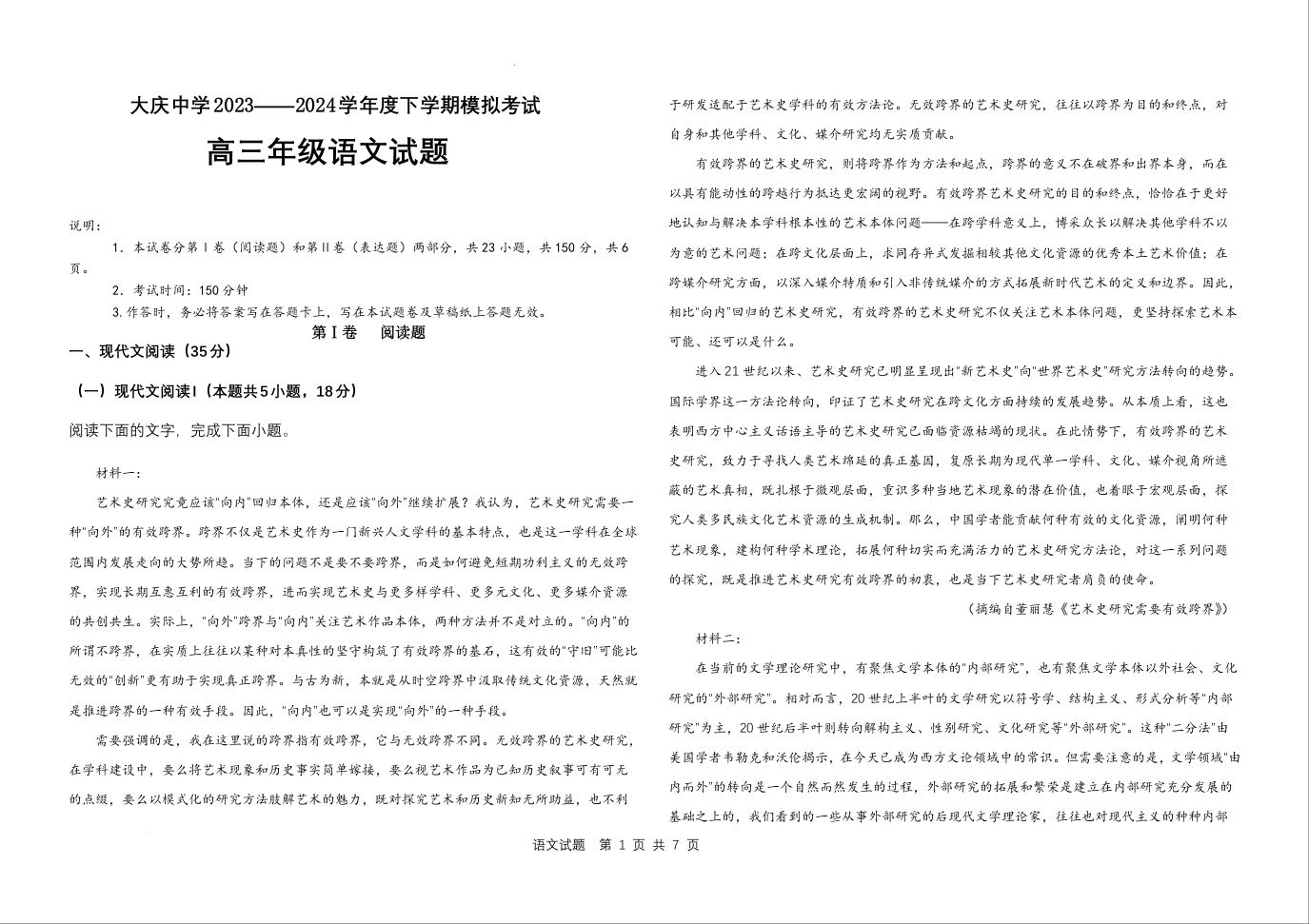黑龙江省大庆市大庆中学2024届高三5月期中考试语文