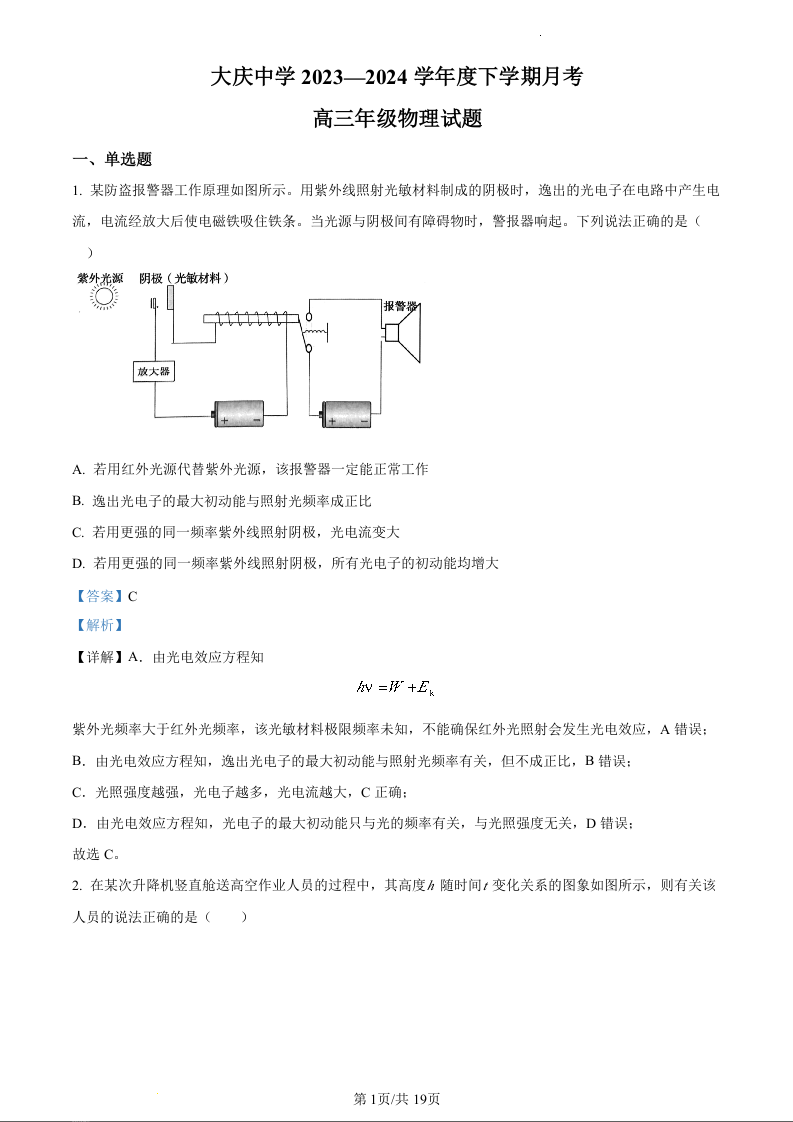 黑龙江省大庆市大庆中学2024届高三5月期中考试物理(精品解析版)