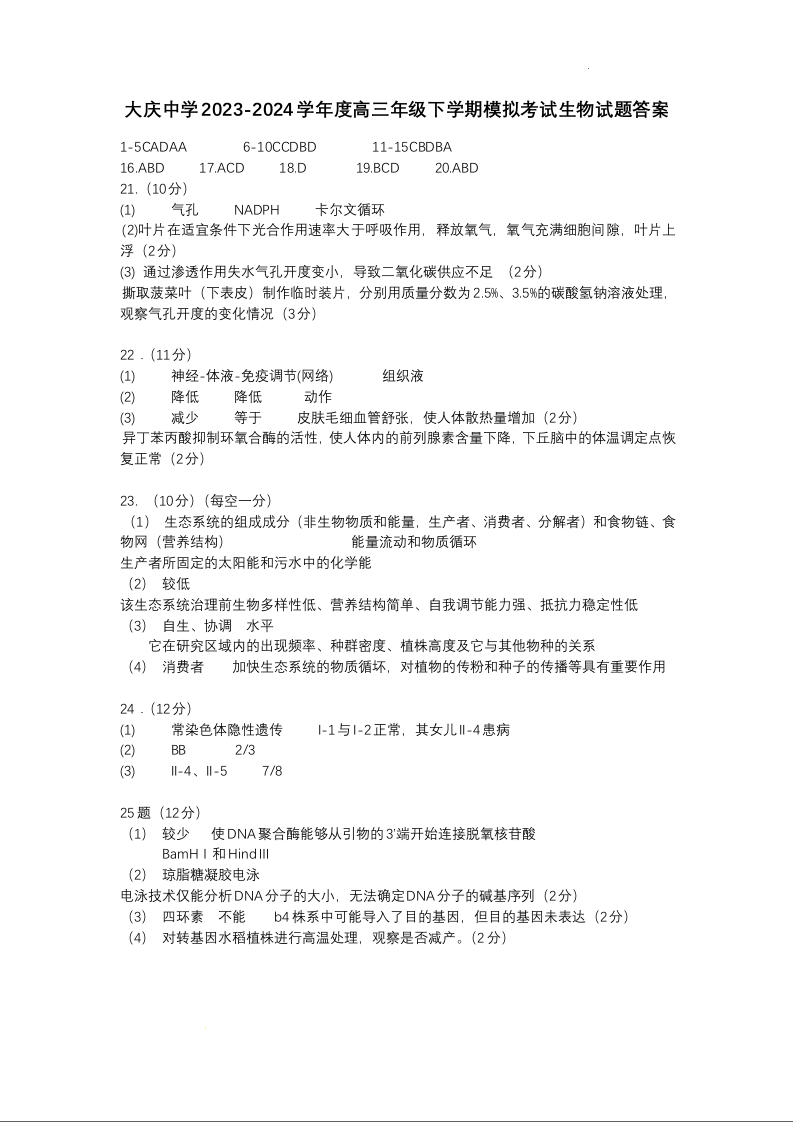 黑龙江省大庆市大庆中学2024届高三5月期中考试生物答案