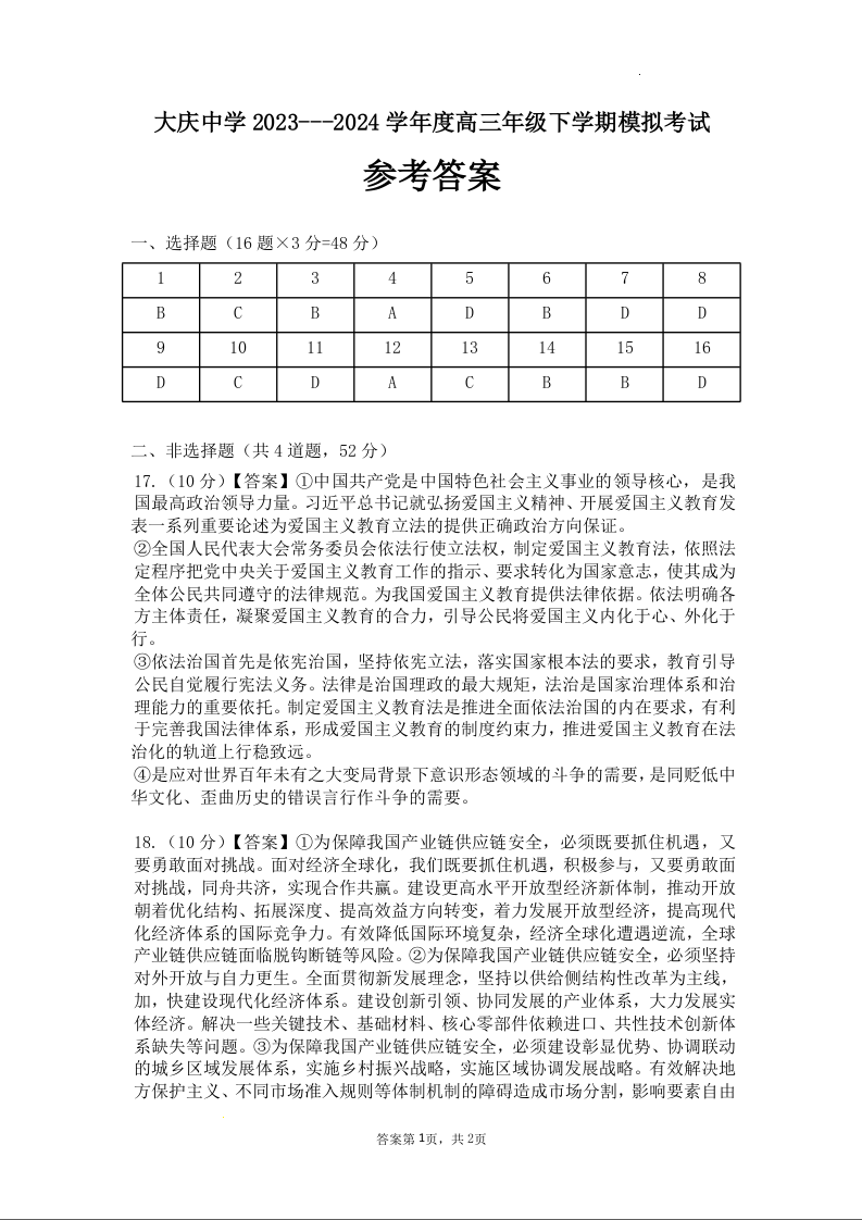 黑龙江省大庆市大庆中学2024届高三5月期中考试政治答案