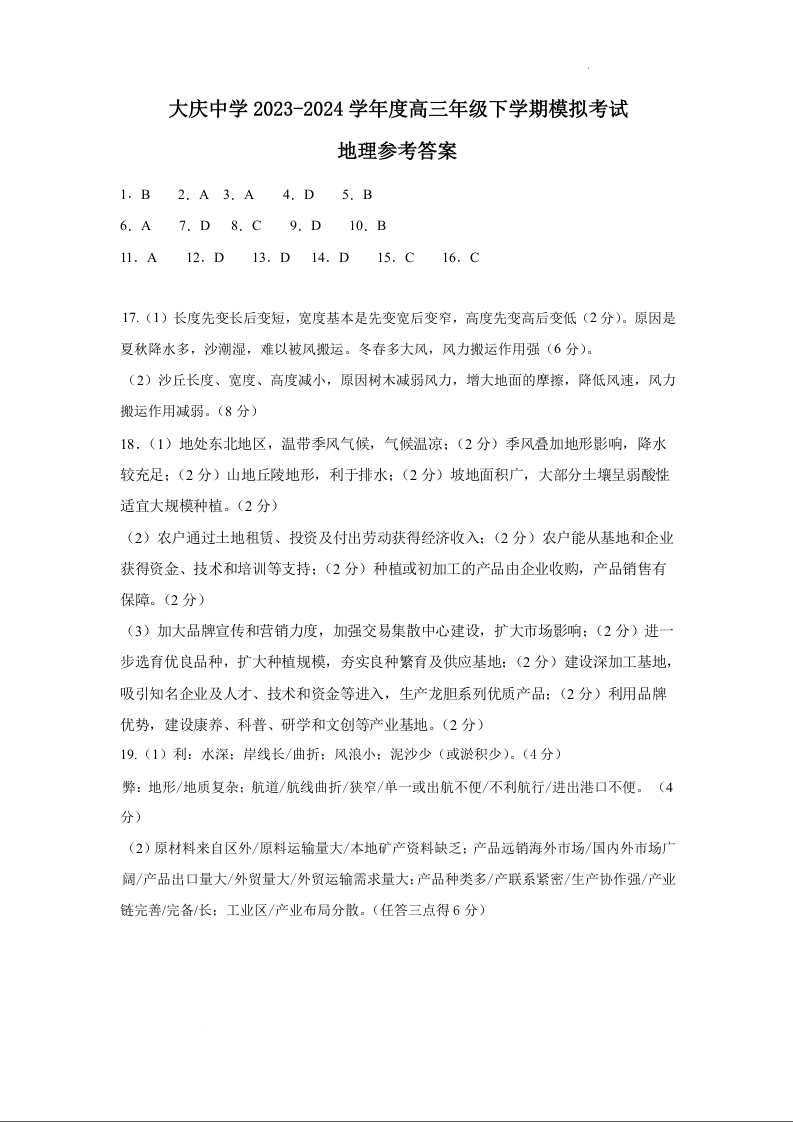 黑龙江省大庆市大庆中学2024届高三5月期中考试地理答案