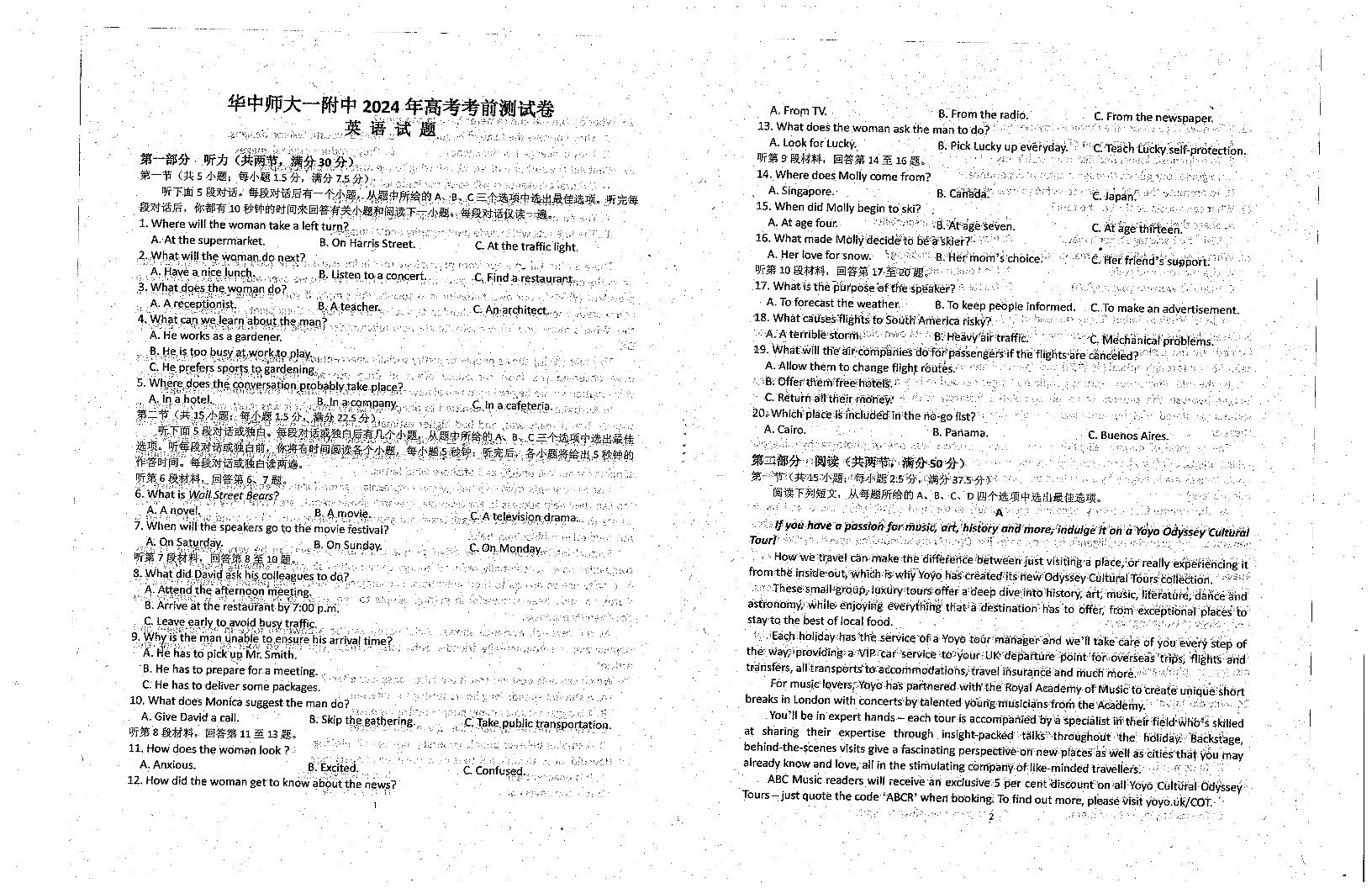湖北省武汉市华中师范大学第一附属中学高三考前素养测试卷英语