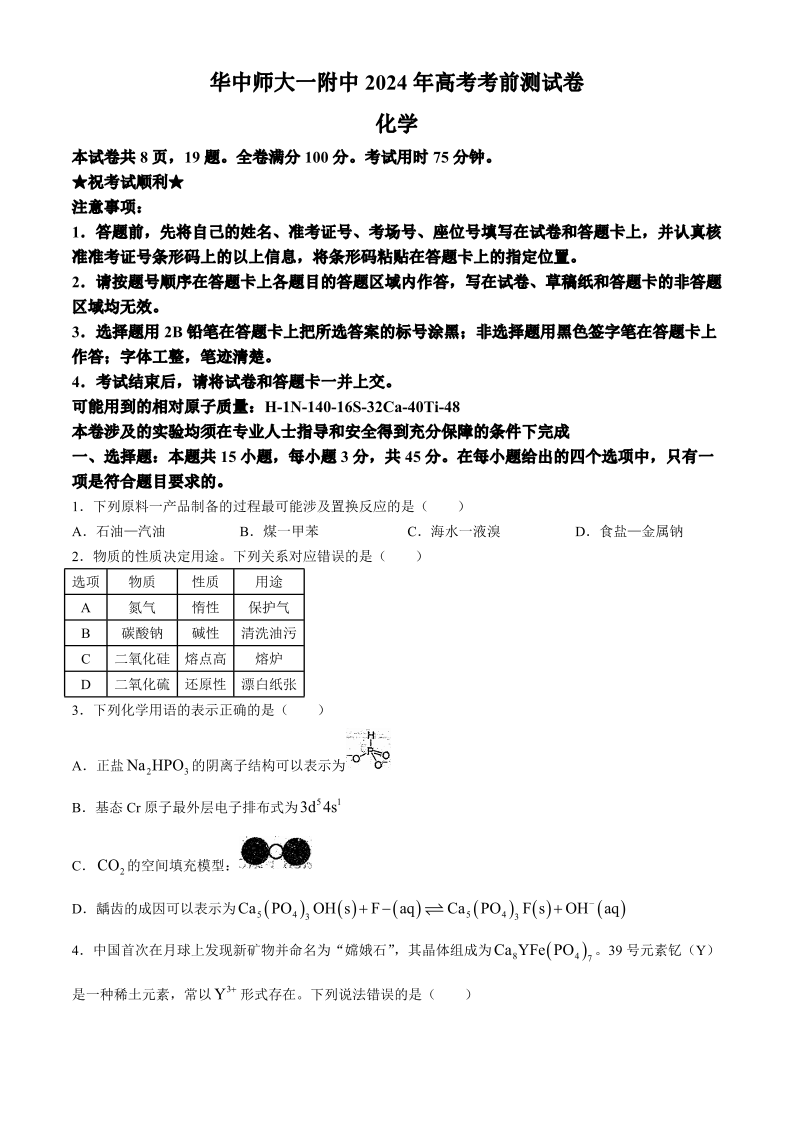 湖北省武汉市华中师范大学第一附属中学高三考前素养测试卷化学