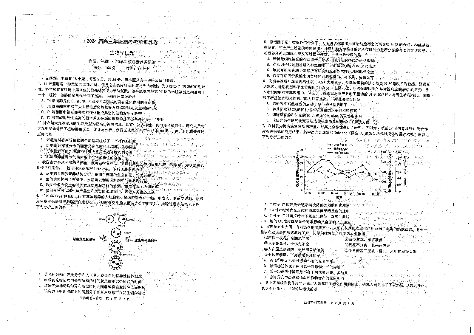 湖北省武汉市华中师范大学第一附属中学高三考前素养测试卷生物