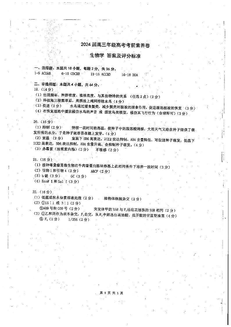 湖北省武汉市华中师范大学第一附属中学高三考前素养测试卷生物答案