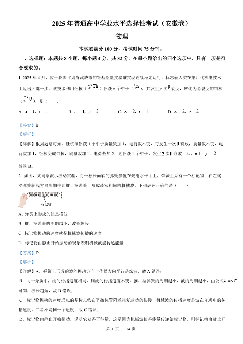 2025年物理高考真题(解析版)--安徽卷