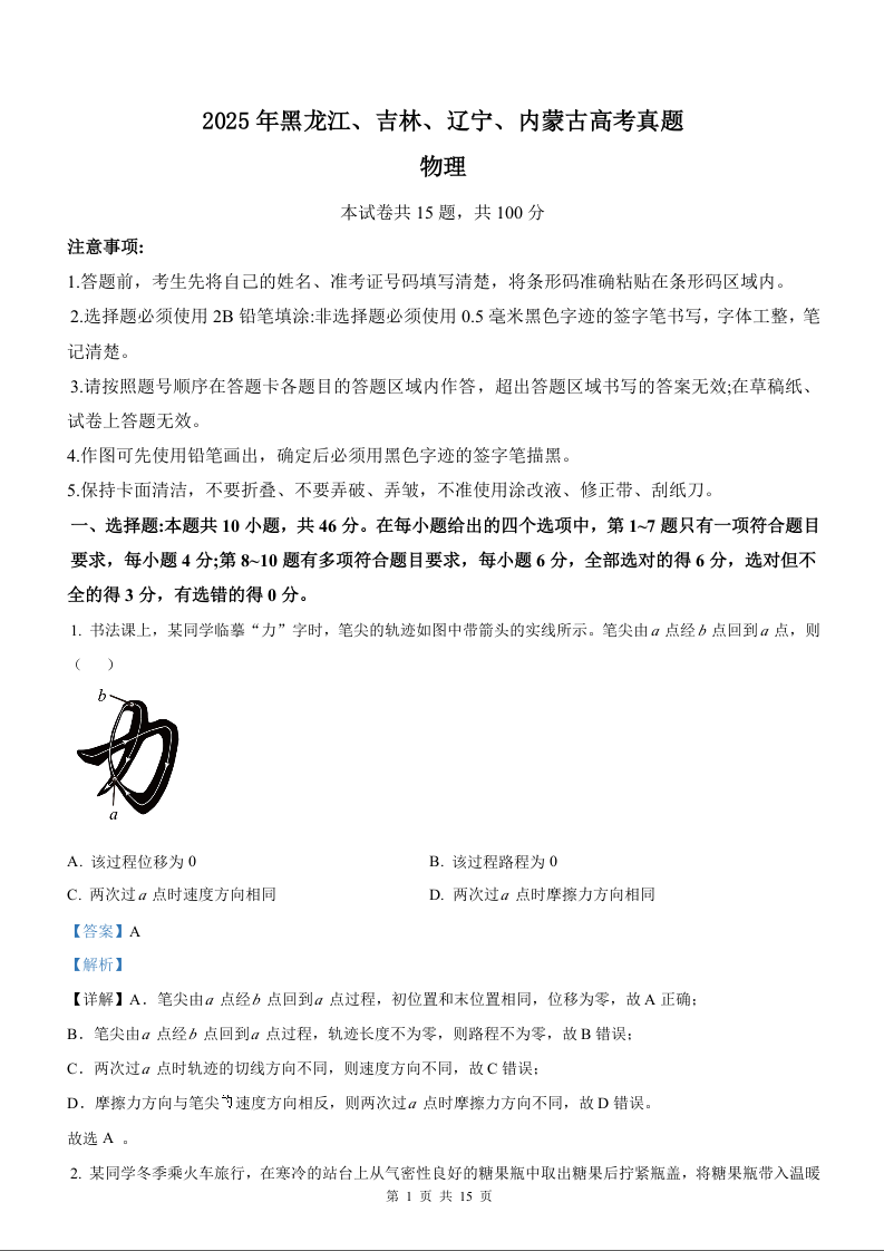 2025年物理高考真题(解析版)--黑龙江、吉林、辽宁、内蒙古卷