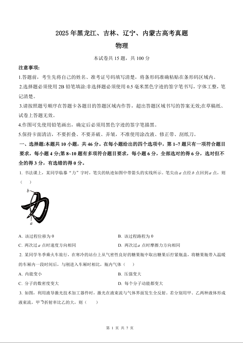 2025年物理高考真题--黑龙江、吉林、辽宁、内蒙古卷