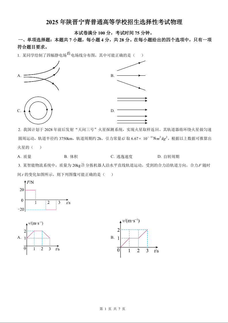 2025年物理高考真题--陕西、山西、青海、宁夏卷