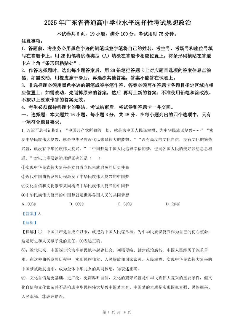 2025年政治高考真题(解析版)--广东卷