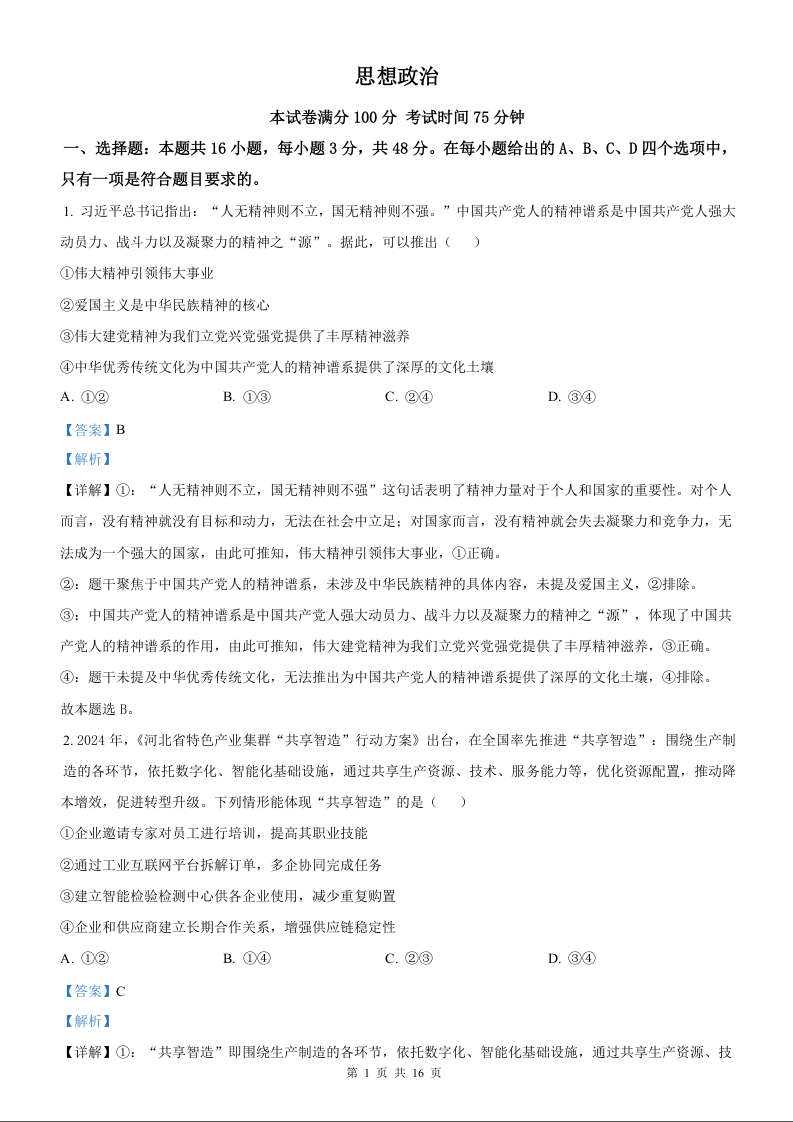 2025年政治高考真题(解析版)--河北卷