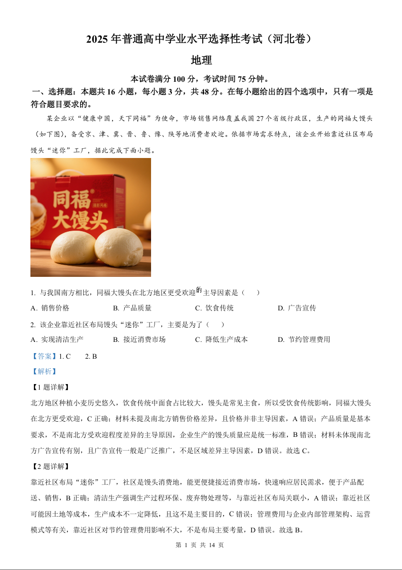 2025年地理高考真题(解析版)--河北卷