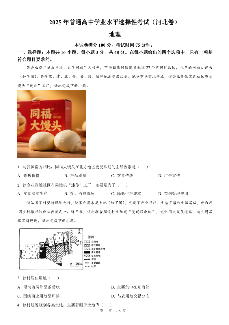 2025年地理高考真题--河北卷