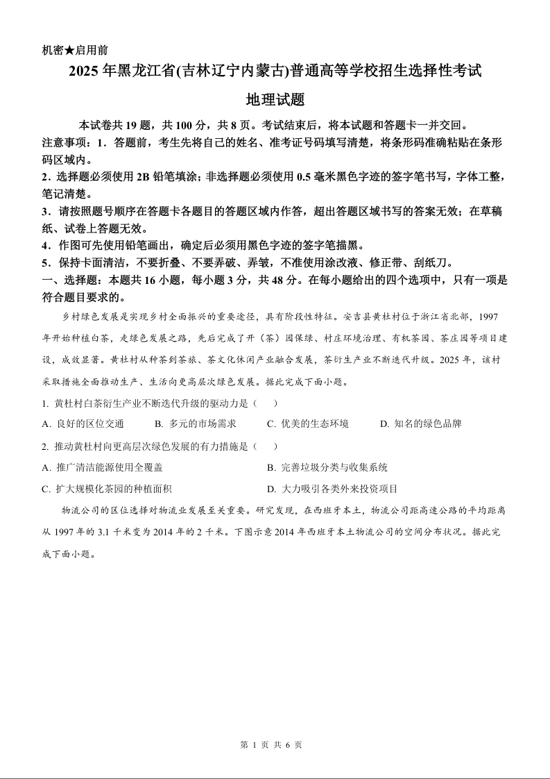 2025年地理高考真题--黑龙江、吉林、辽宁、内蒙古卷