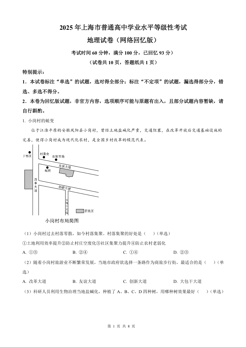 2025年地理高考真题(网络回忆版)上海卷