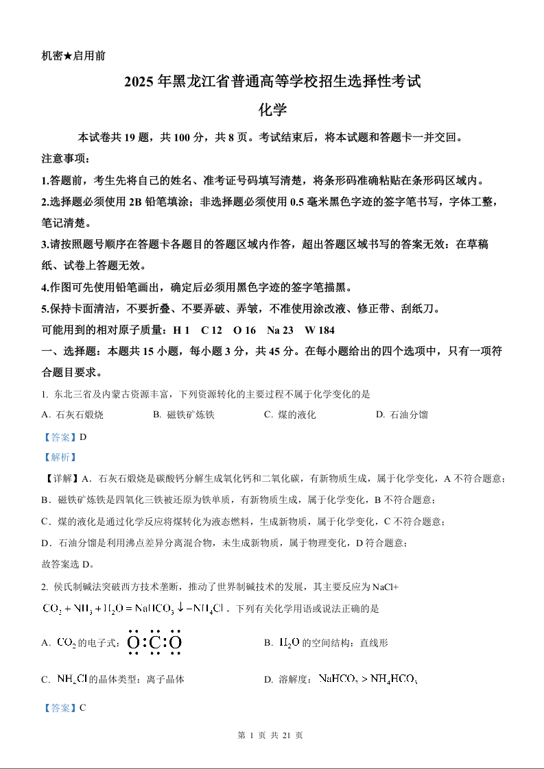 2025年化学高考真题(解析版)--黑龙江、吉林、辽宁、内蒙古卷