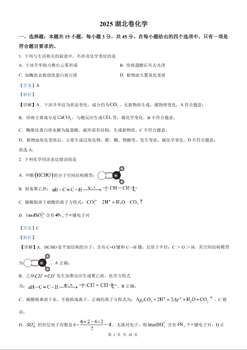 2025年化学高考真题(解析版)--湖北卷