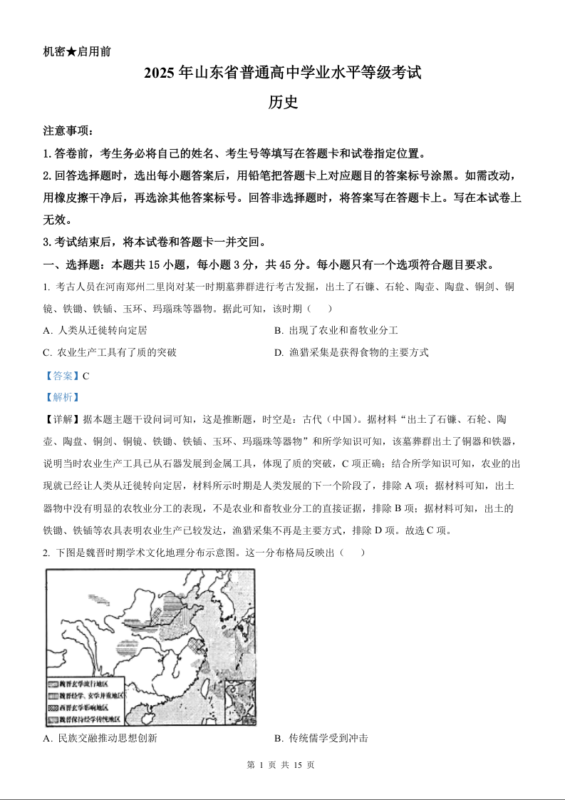 2025年历史高考真题(解析版)--山东卷