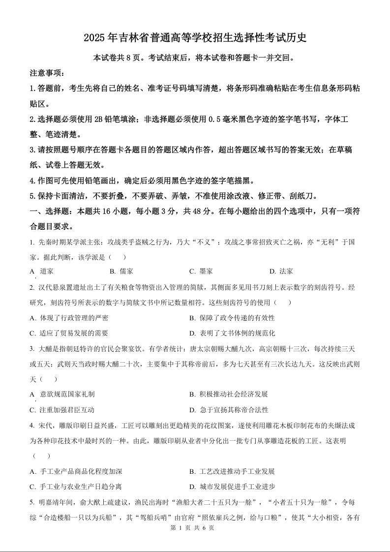 2025年历史高考真题--黑龙江、吉林、辽宁、内蒙古卷
