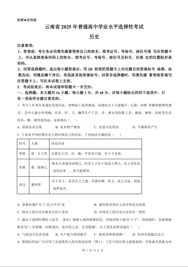 2025年历史高考真题--云南卷
