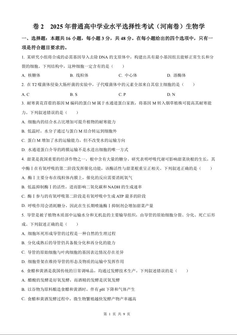 2025年生物高考真题--河南卷