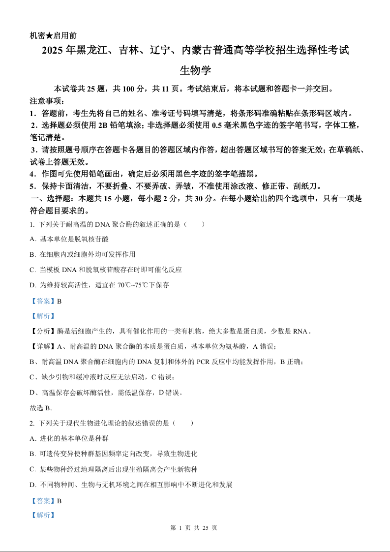2025年生物高考真题(解析版)--黑龙江、吉林、辽宁、内蒙古卷