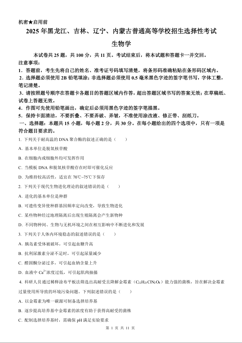 2025年生物高考真题--黑龙江、吉林、辽宁、内蒙古卷